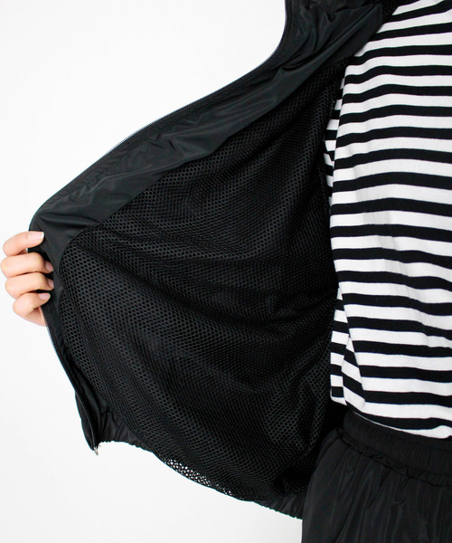 襟元には収納可能なフード付きで、2WAYでコーディネートを楽しんでいただけます。裏地はメッシュ素材で、軽くて通気性がよく、暖かいシーズンも軽い羽織として使いやすい仕様になっています。