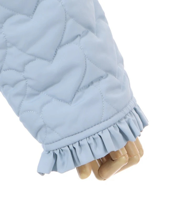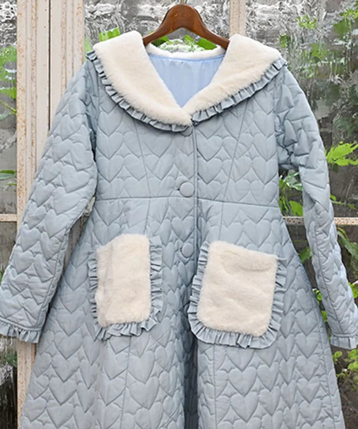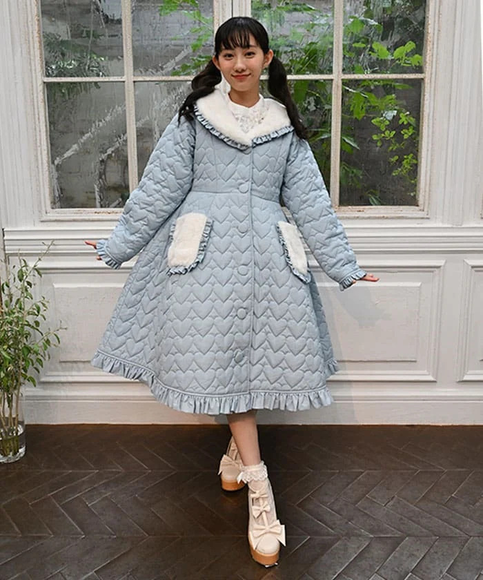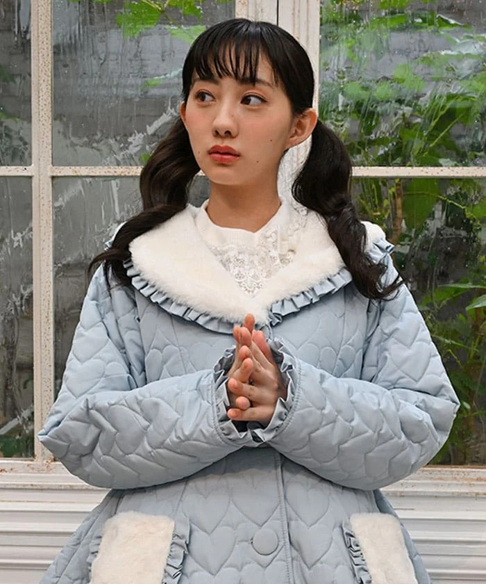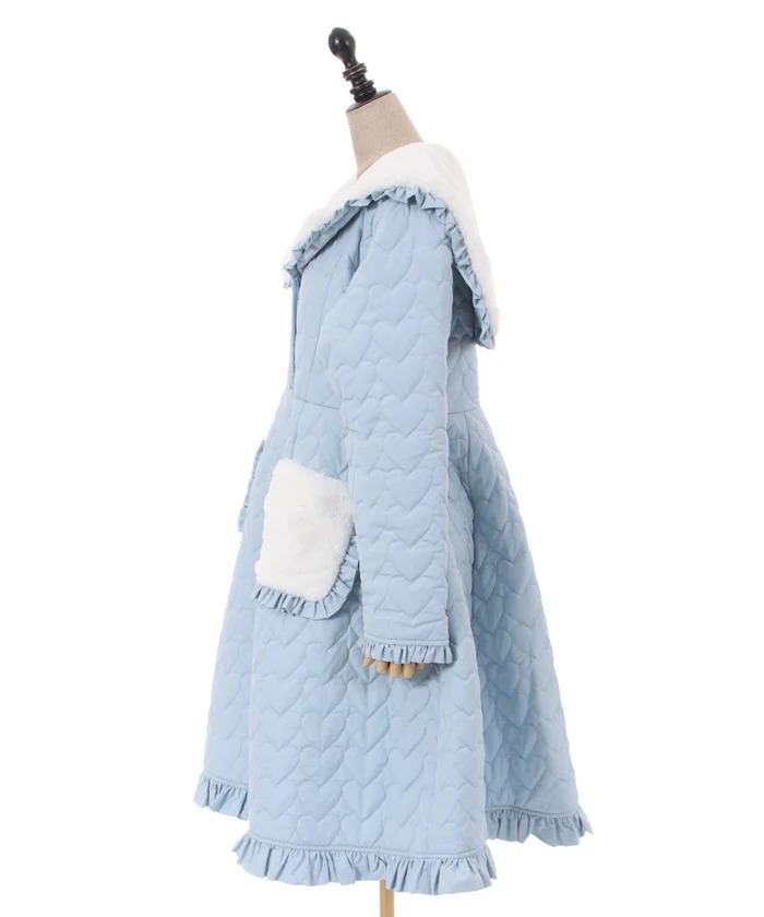 A lovely coat with a fit-and-flare silhouette, made from a cute heart-patterned quilted fabric. Packed with a firm layer of padding, this coat retains its puffy silhouette even without a pannier. With fur on the sailor collar and pockets, this coat is a must for girly style lovers.