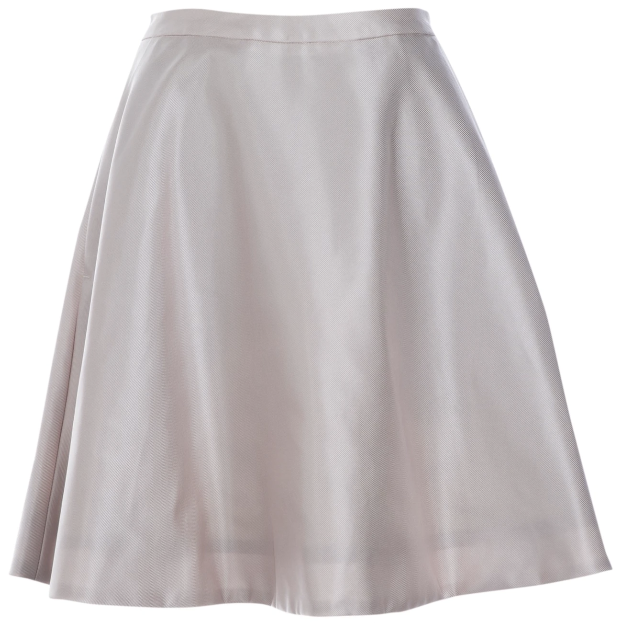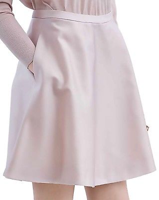 Flared skirt in powder pink color. Nylon ribbed waistband, two side pockets, center back gold zip closure, fully lined, high-waisted, no stretch, above the knee fit. See images for details.