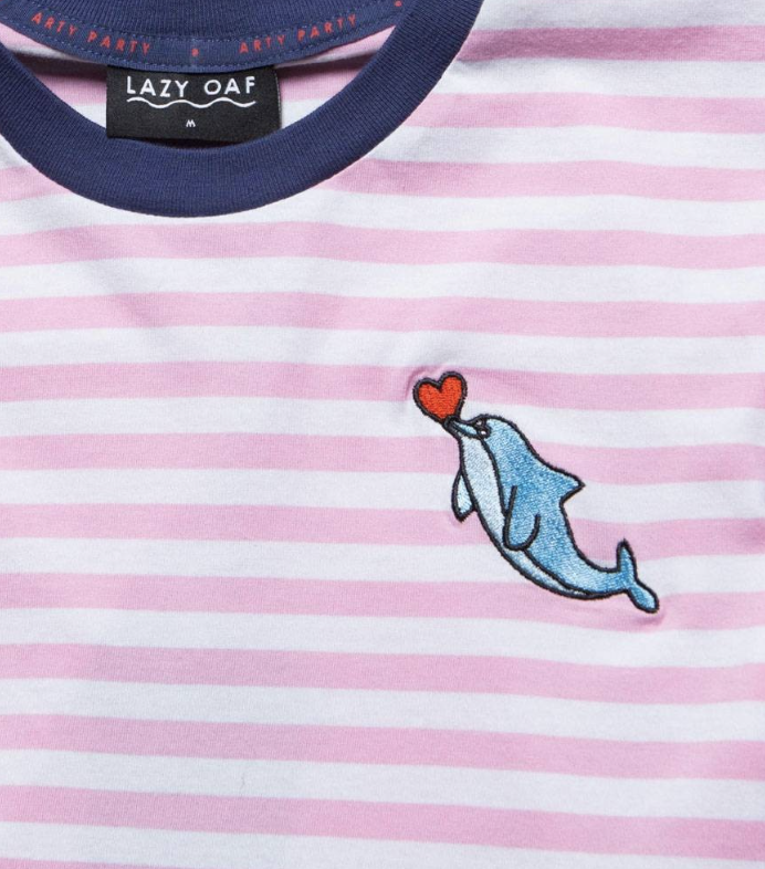 Lazy Oaf Dolphin Heart Tee has us flippin’ for yew, boo. This cute lil ringer t-shirt is xtra soft, with its pretty pink stripes and stretchy snug fit. Featurin’ a sweet embroidered dolphin patch and contrasting trim.