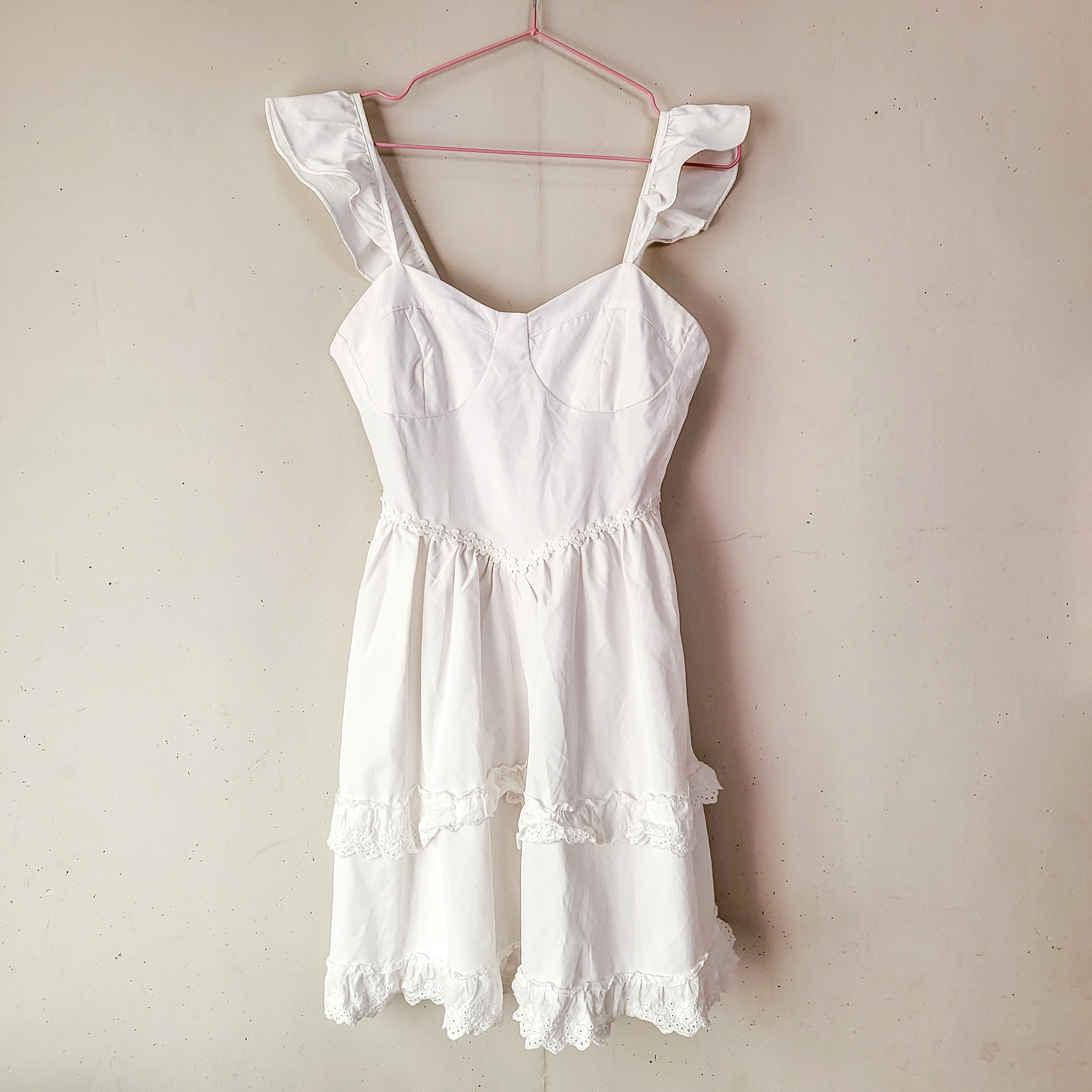 A woven mini dress featuring a bustier-inspired design, sweetheart neckline, empire waist, and tiered A-line silhouette.
