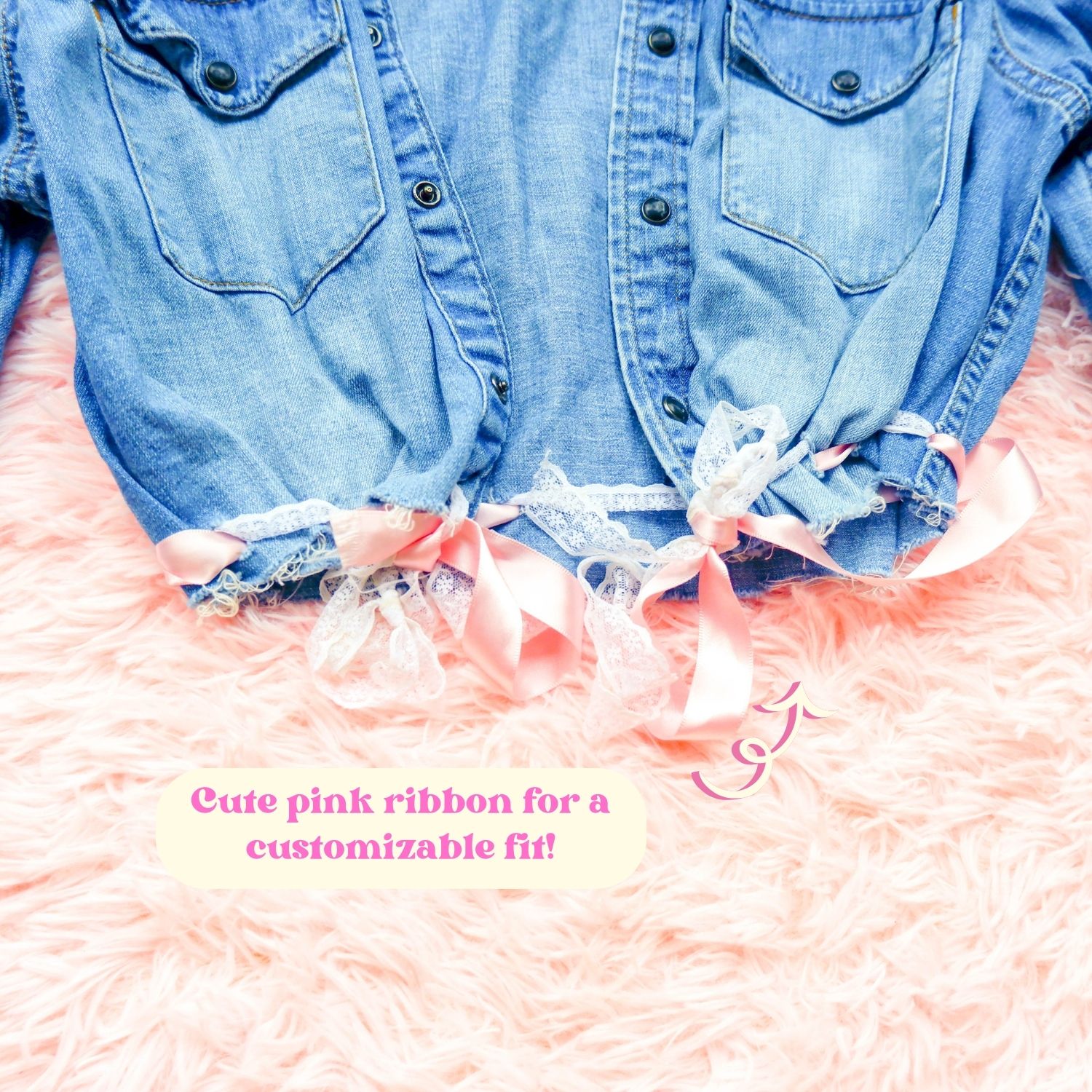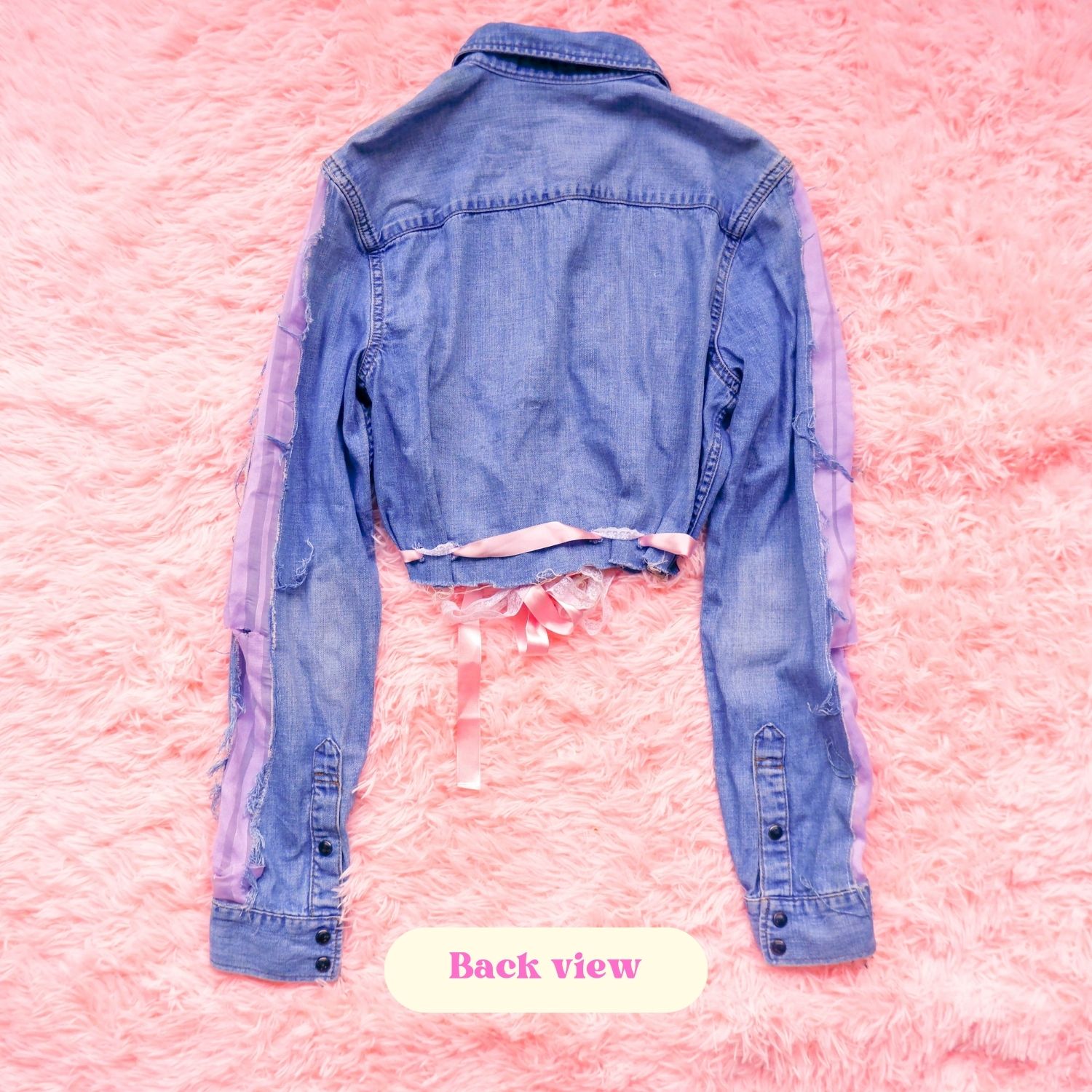 Upcycled Denim Coquette Cropped Jacket | Vintage Reconstructed XS-S | Pink Ribbon Waist Detail
